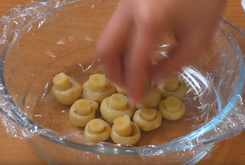Викласти перший шар салату: гриби капелюшками вниз.![]()