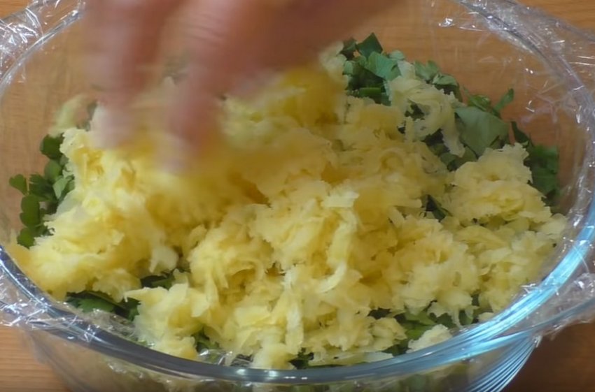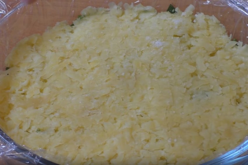 Рівномірно розподілити потерту на крупній тертці картоплю.![]()