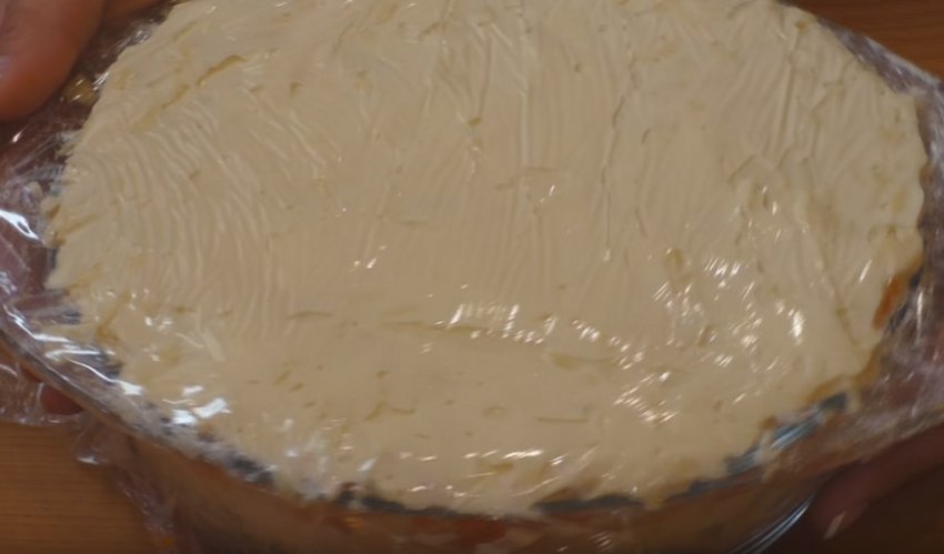 Прикрити салат плівкою. Помістити на кілька годин (краще на ніч) для просочування в холодильник.![]()