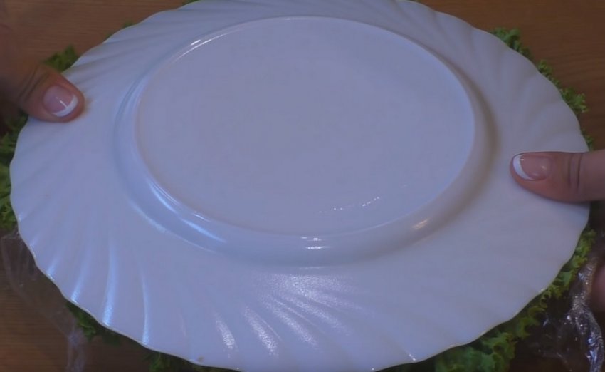 Прикрити ємність із салатом плоским блюдом. Перевернути посуд таким чином, щоб гриби опинилися вгорі.![]()