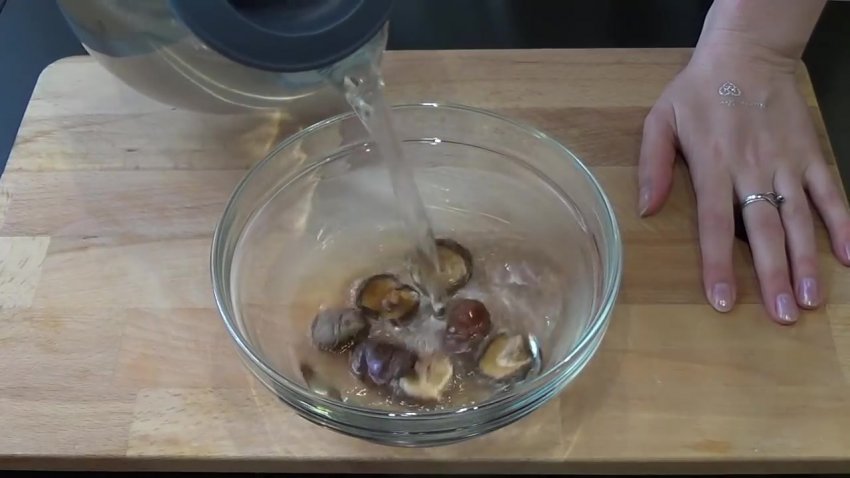 Шиітаке необхідно замочити в гарячій воді на кілька годин, поки вони не стануть м'якими.![]()