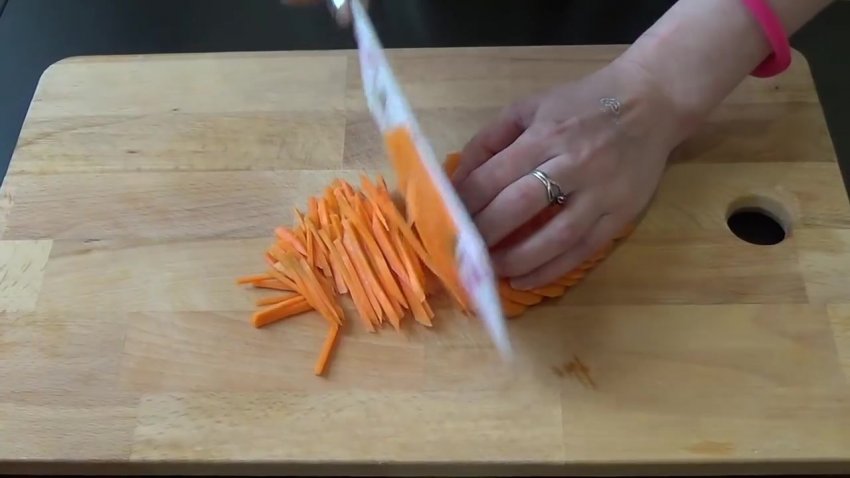 овоч вимити і почистити, потім моркву нарізати соломкою, а цибулину - тонкими півкільцями.![]()