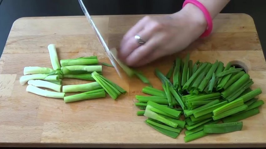 Зелену цибулю потрібно помити і нарізати на довгі шматки (приблизно 5-6 см завдовжки), товсті частини стебел розрізати навпіл.![]()