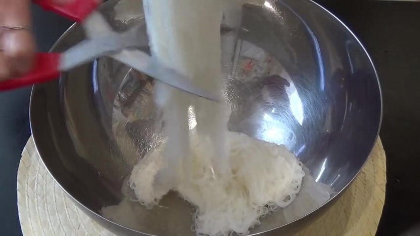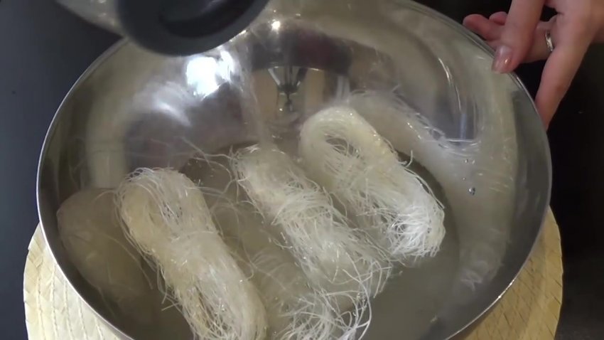 локшину викласти в глибоку чашу, залити окропом, тримати у воді 3 хвилини, поки вона не стане м'якою.![]()