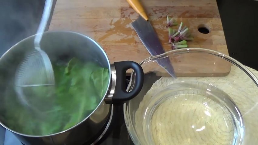 каструлю на плиті, коли вода почне закипати, необхідно помістити туди шпинат і протягом 1 хвилини бланшувати.![]()