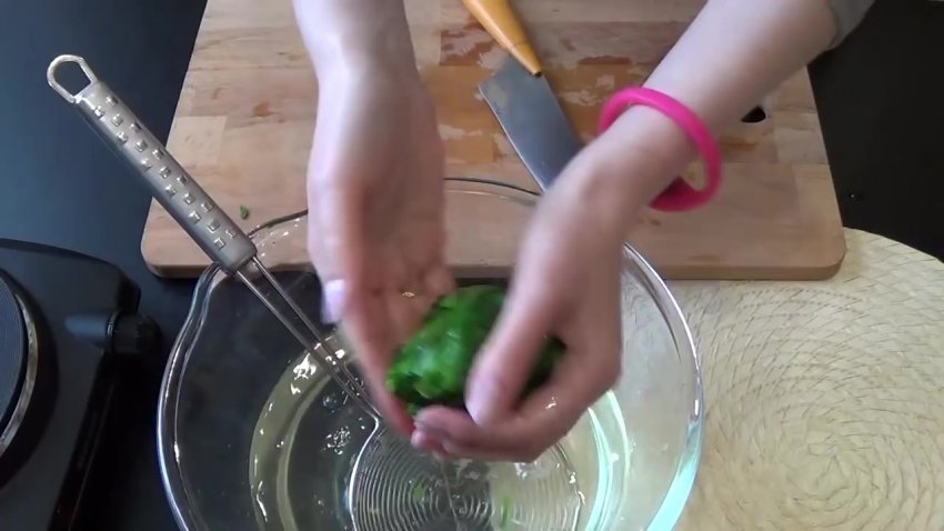 закінчення хвилини дістати листя з каструлі і помістити в миску з холодною водою, бажано з льодом. Коли він охолоне, дістати отриману кулю і дбайливо віджати зайву воду, не пошкодивши структуру.![]()