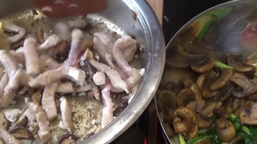 додати трохи олії й обсмажити гриби, викласти всі термічно оброблені компоненти в миску з локшиною.![]()