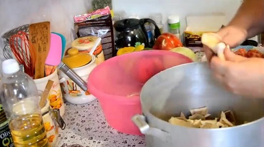 - Перекласти гриби в глибоку сковороду, сотейник або казан. Тушкувати на повільному вогні з олією близько 30 хвилин, постійно помішуючи лопаткою.