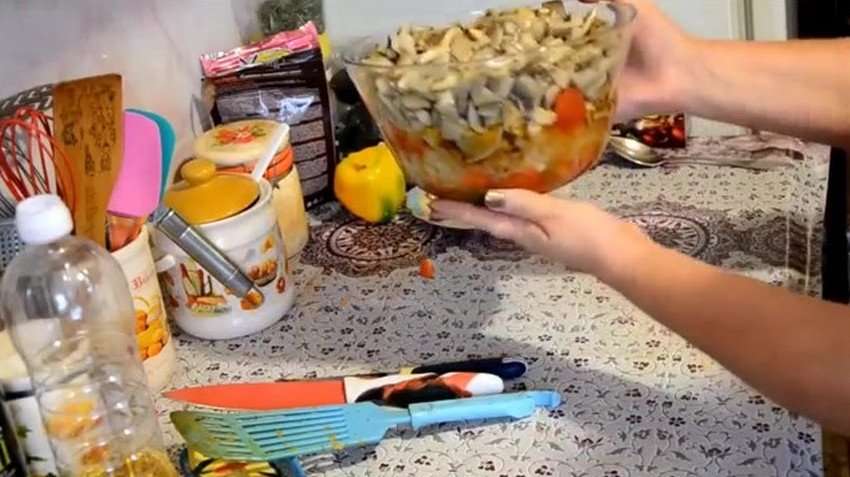 - Змішати грузді зі смаженими овочами, додати цукор, оцет, спеції, подрібнену петрушку та роздавлений або натертий часник.