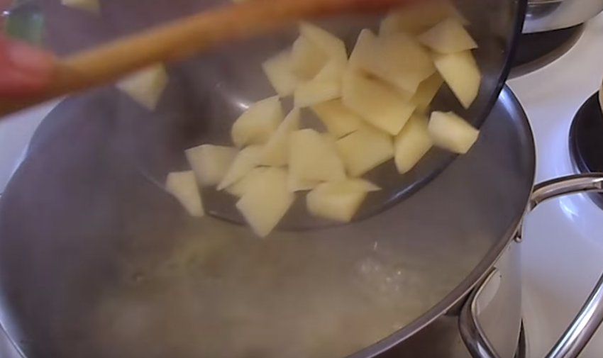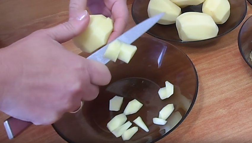 - Картоплю очистити, помити, порізати невеликими кубиками, додати в бульйон.