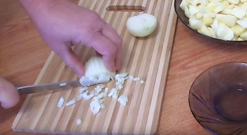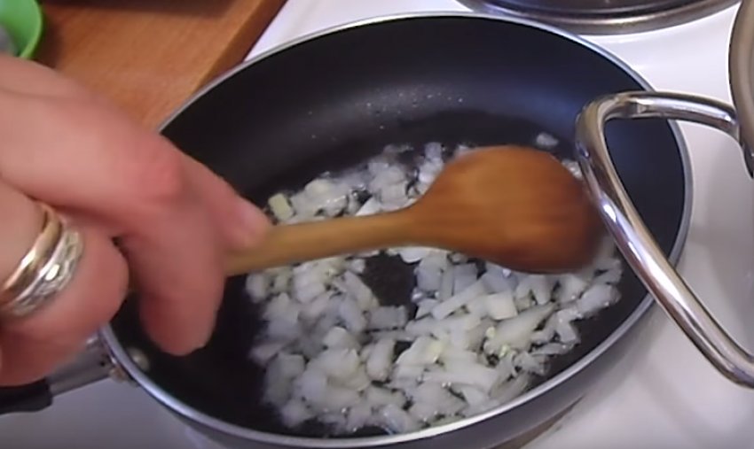 - Дрібно порізану цибулю обсмажити до золотистого кольору на сковорідці, додавши туди олію.