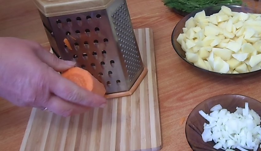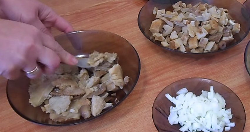 Грузді промити в холодній воді. Четверту частину грибів розім'яти виделкою, решту покришити дрібними кубиками.![]()