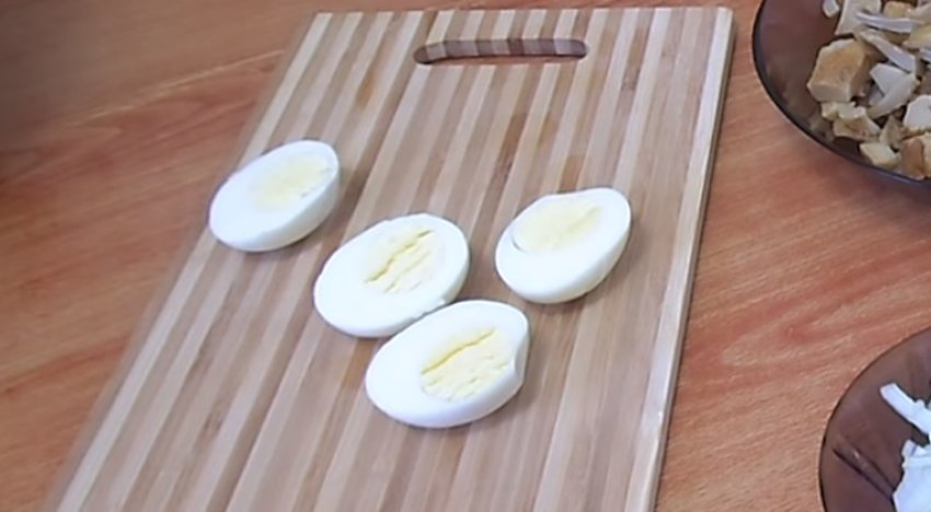 Яйця відварити круто, очистити, розрізати навпіл.![]()