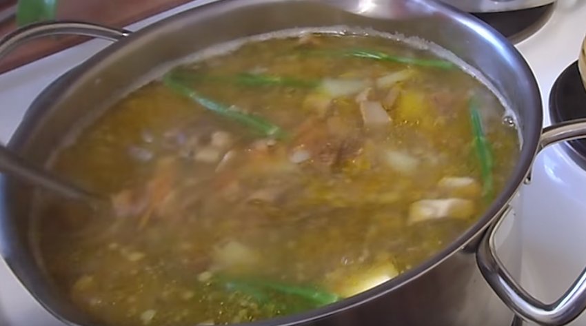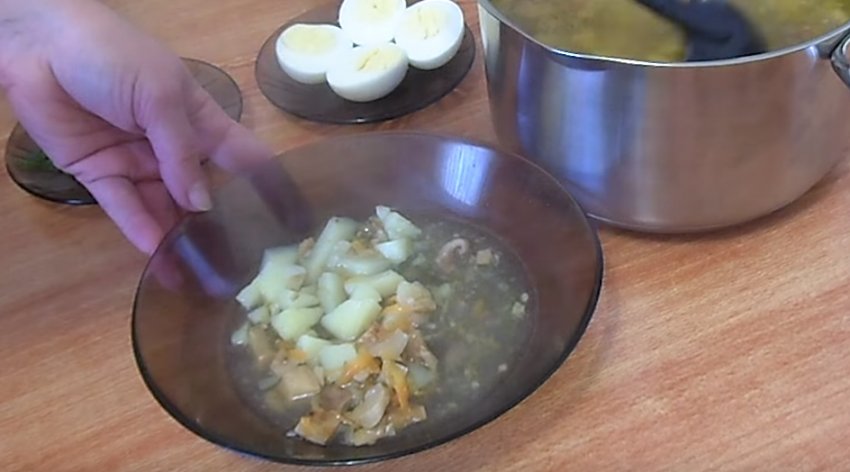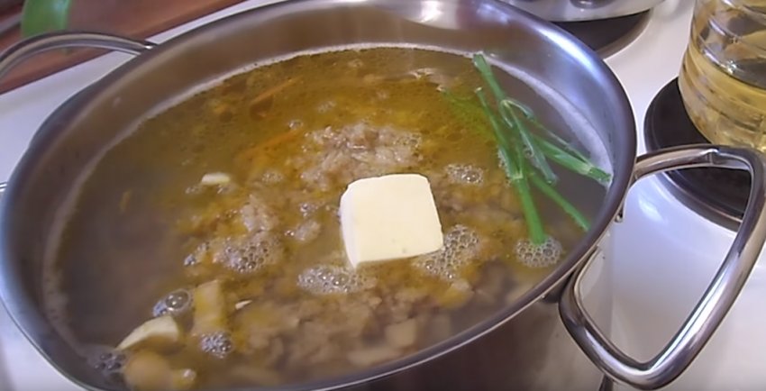 У суп покласти черешки від зелені, засмажку, гриби, нарізані кубиками і перетерті, лавровий лист, вершкове масло.![]()