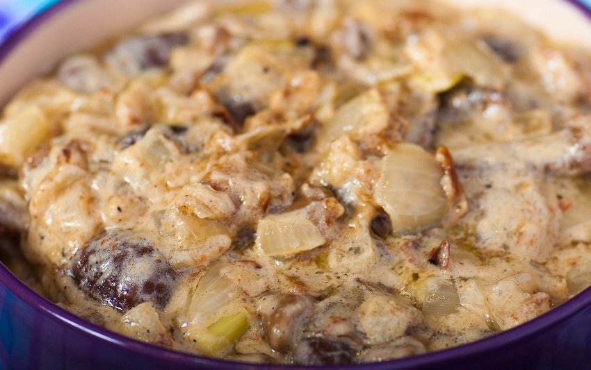 - Разом із вершками додати його в сковорідку, перемішуючи з іншими продуктами, щоб не з'явилися грудки.