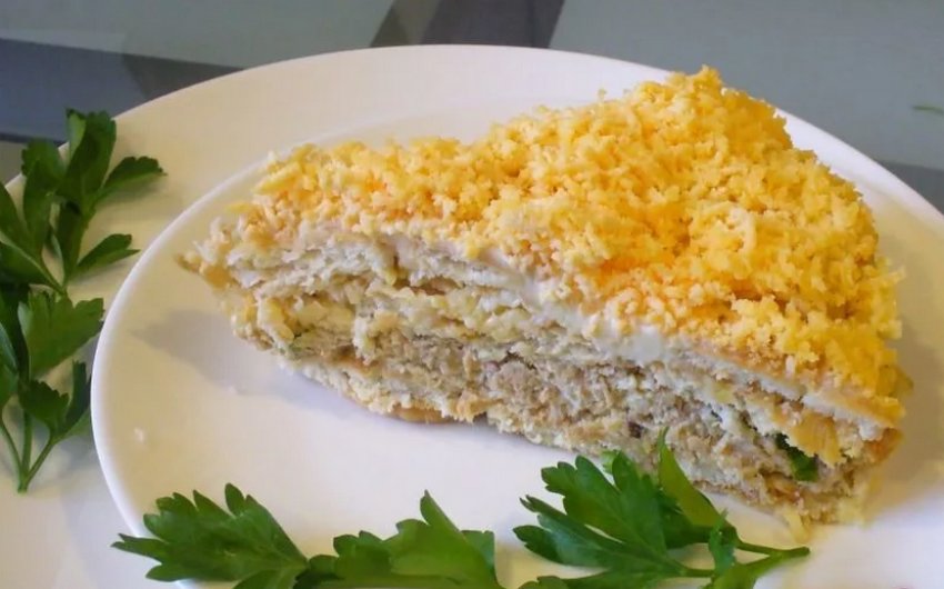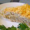- У глибоку ємність викласти шари з цибулі, солоних крекерів, сиру, смажених грибів і яєць, змащуючи кожен шар майонезом.