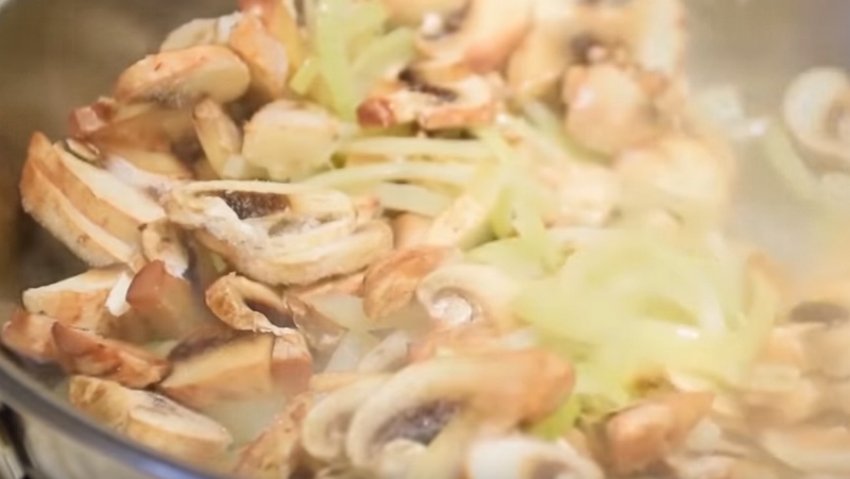 Додайте до цибулі гриби, сіль і трохи перцю, а потім підсмажте суміш до повної готовності.![]()