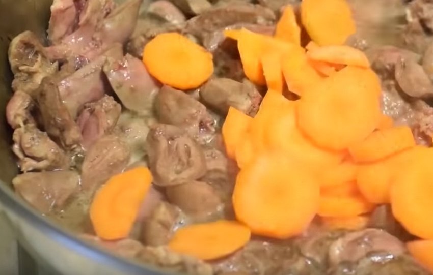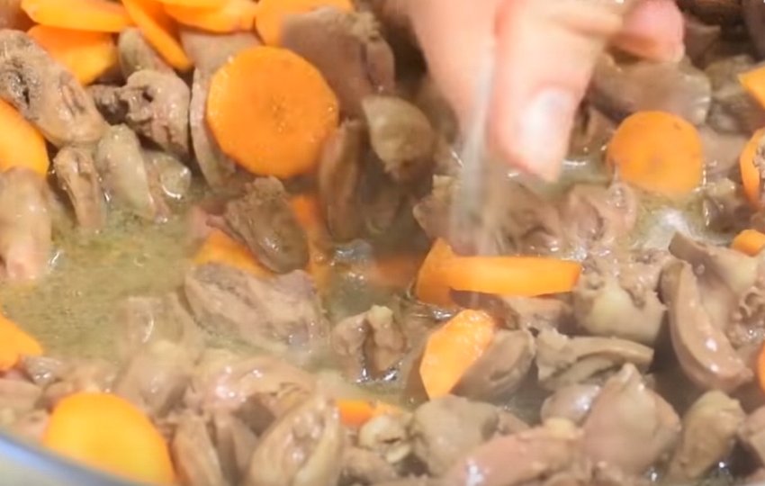 На окремій пательні обсмажте на соняшниковій олії курячі серця 2-5 хвилин, а потім з'єднайте їх із подрібненою морквою.![]()