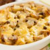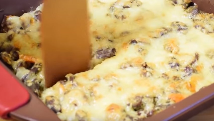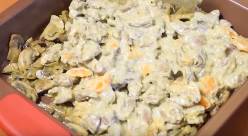 Змастіть глибоку ємність для запікання соняшниковою олією, після цього шарами покладіть піджарку з цибулі та грибів, а потім суміш із тушкованого в сметані субпродукту і моркви.![]()