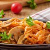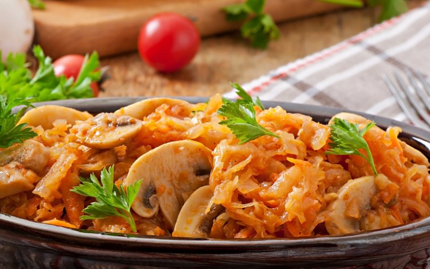 - Гриби посмажити разом із ріпчастою цибулею. Коли з'явиться рум'яна скоринка, відправити їх до капусти, залишити тушкуватися ще 5 хвилин.