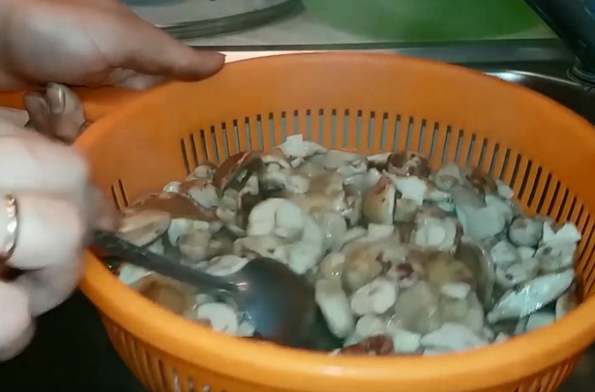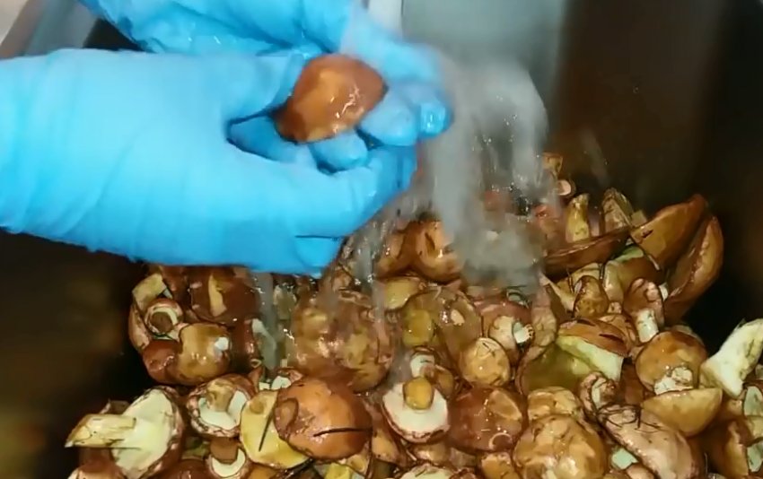 Помити гриби під проточною водою кілька разів, щоб видалити все сміття, що налипло на них. Молоді гриби не потрібно очищати. А в старих краще зняти шкірку з капелюшків.![]()