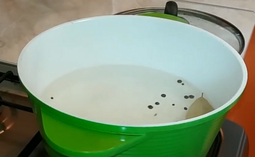 Додати сіль, цукор, 2 чорних і 2 запашних горошини перцю, а також 2 лаврових листки. Через кілька хвилин зняти з вогню.![]()