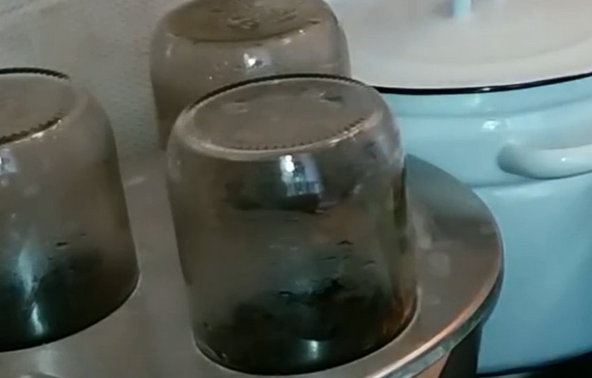 Простерилізувати півлітрові банки протягом 7 хвилин на водяній бані і прокип'ятити кришки 5 хвилин.![]()