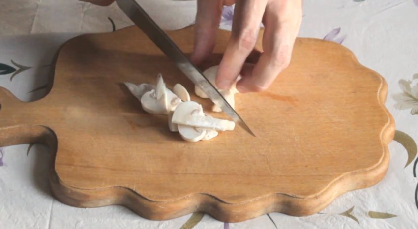 Печериці нарізати тонкими часточками.![]()