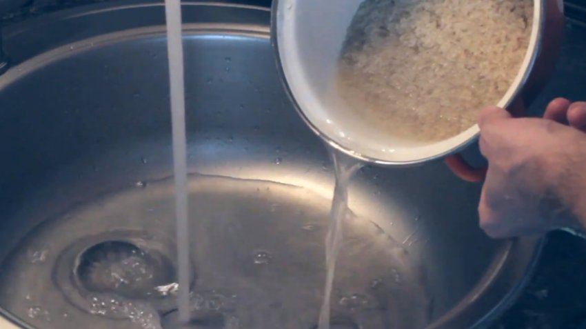 Перед варінням рису його потрібно промити під проточною водою, щоб змити клейкий шар. Повторити процедуру в 5-6 заходів.![]()