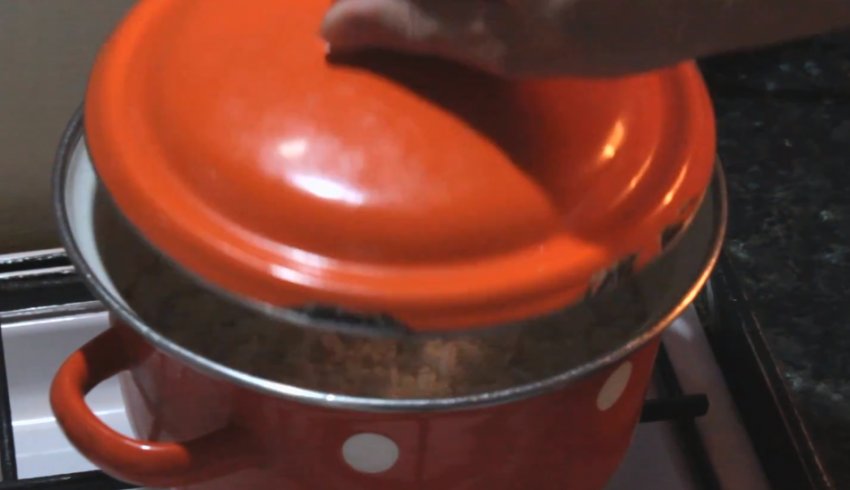 Коли вода над поверхнею рису пішла, змінити силу вогню на мінімум і закрити каструлю кришкою.![]()