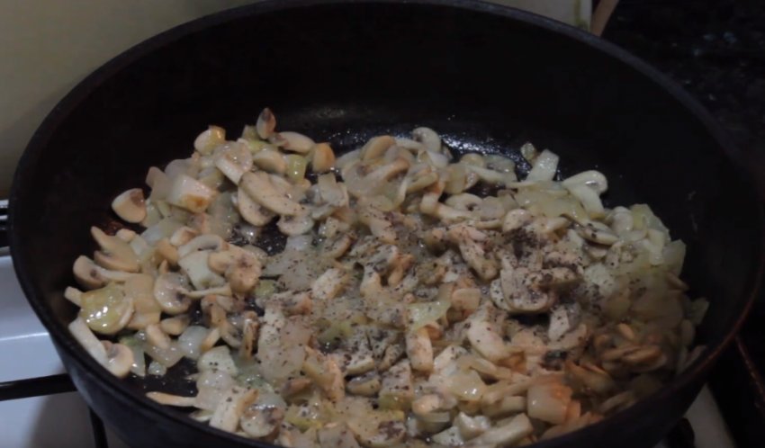 Поки рис вариться, займіться підсмажуванням інгредієнтів. Для цього розігрійте сковорідку з олією і першими викладіть гриби.![]()