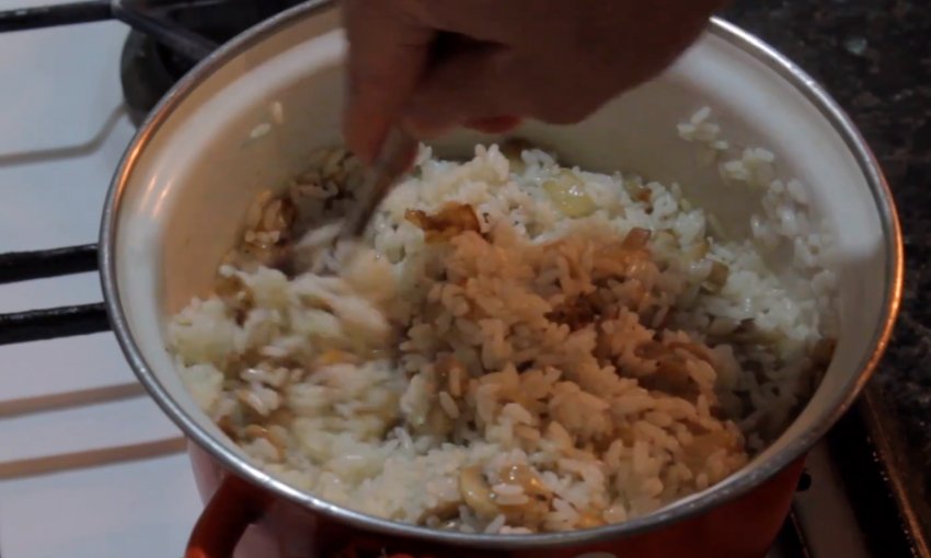 Визначте готовність крупи, вимкніть вогонь і додайте в каструлю печериці з цибулею.![]()