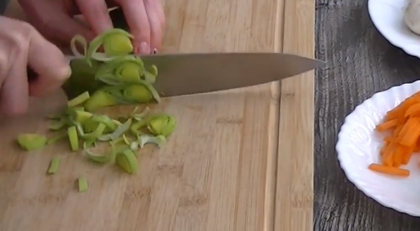 Цибулю порей нарубати кільцями шириною 0,5 см або дрібно накришити іншу наявну зелень.![]()