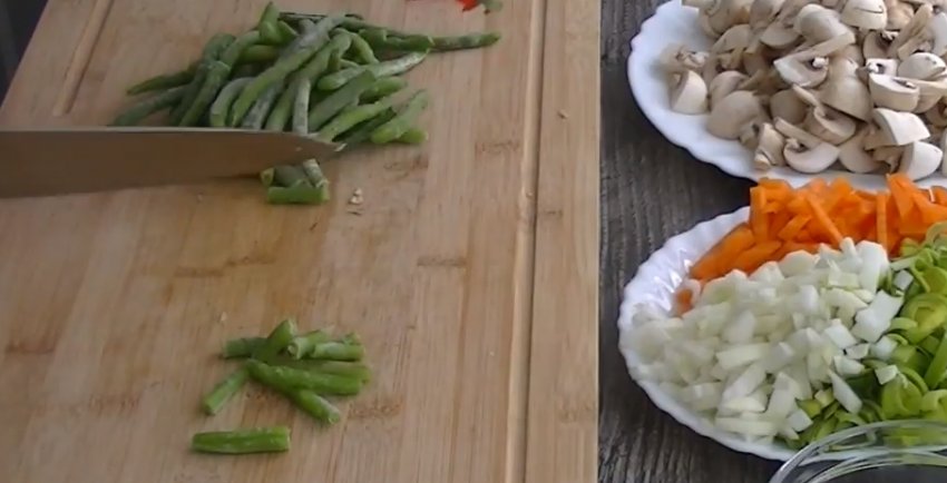 Кожен стручок спаржі розрізати на кілька шматочків.![]()