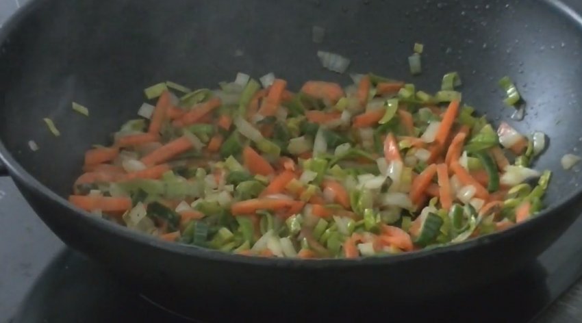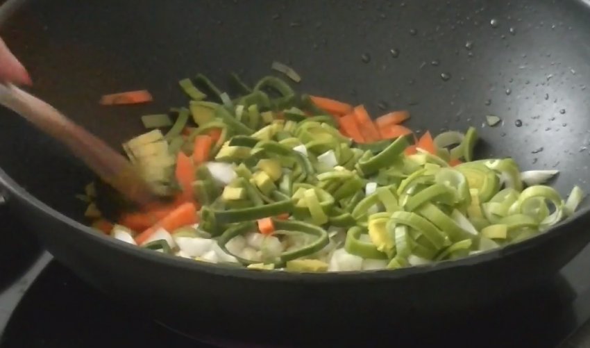 Потім відправте смажитися цибулю ріпчасту і цибулю порей протягом також 3-4 хв.![]()