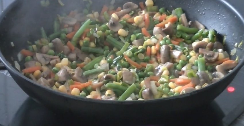 Потім на пательню викласти печериці, зелений горошок, стручкову квасолю та кукурудзу. Ретельно перемішати продукти і тушкувати протягом 6 хв.![]()