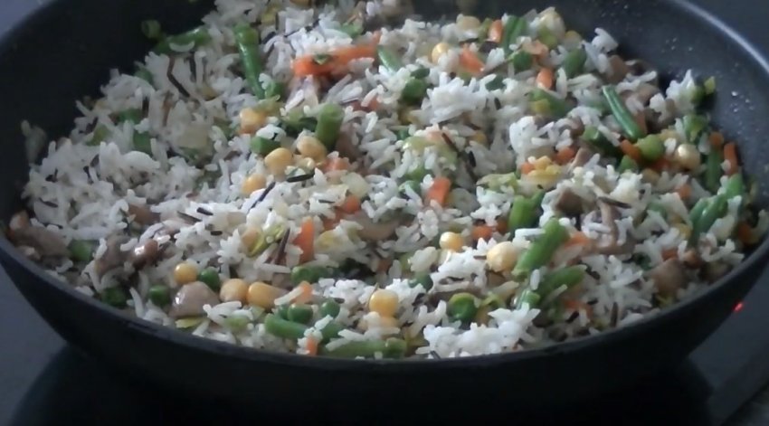 Коли овочі будуть готові, відправте на сковорідку відварений рис, перемішайте і вимкніть вогонь.![]()