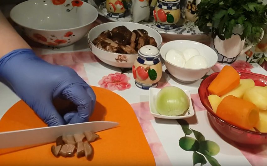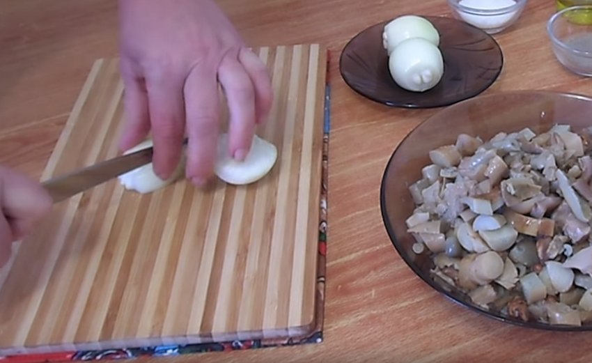 Гриби наріжте дрібно на обробній дошці, спочатку на смужки шириною 5 мм, потім - на квадрати.![]()