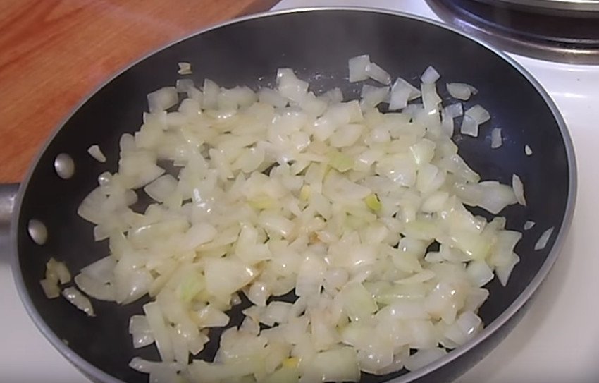 В окремій сковороді розігріти 1 ст. л. олії та пасерувати цибулю до напівпрозорого кольору. Коли цибуля почне злегка підрум'янюватися, вогонь слід вимкнути, зняти сковороду з плити, цибулю остудити до кімнатної температури.![]()