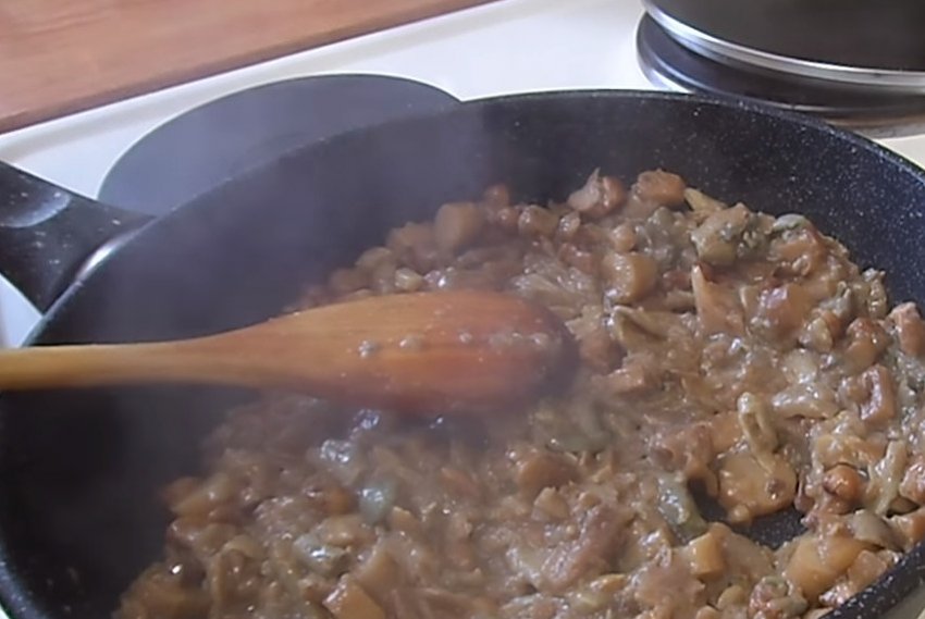 Далі слід розжарити пательню, влити 2 ст. л. олії, почекати, поки вона розігріється, викласти гриби та обсмажувати до повного випаровування вологи, помішуючи дерев'яною ложкою, а коли волога з грибів випарується, і вони почнуть підсмажуватися, вогонь вимкнути, зняти сковорідку з плити, остудити гриби до кімнатної температури.![]()