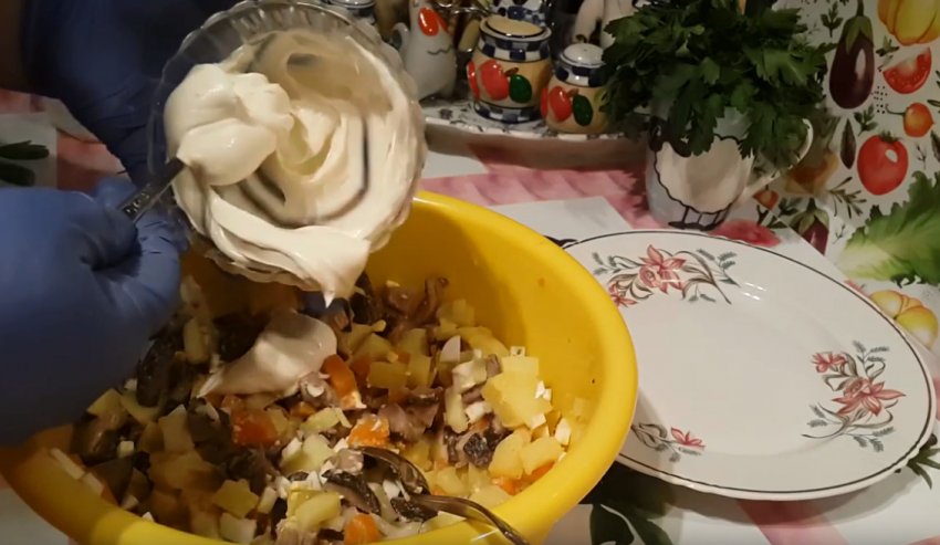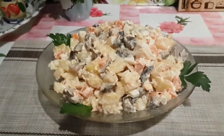Всі компоненти перемішайте в глибокій мисці і заправте майонезом, змішаним зі сметаною, а також додайте перець.Салат розкладіть на красиві плоскі тарілки, прикрасьте зверху листям зеленої петрушки.![]()