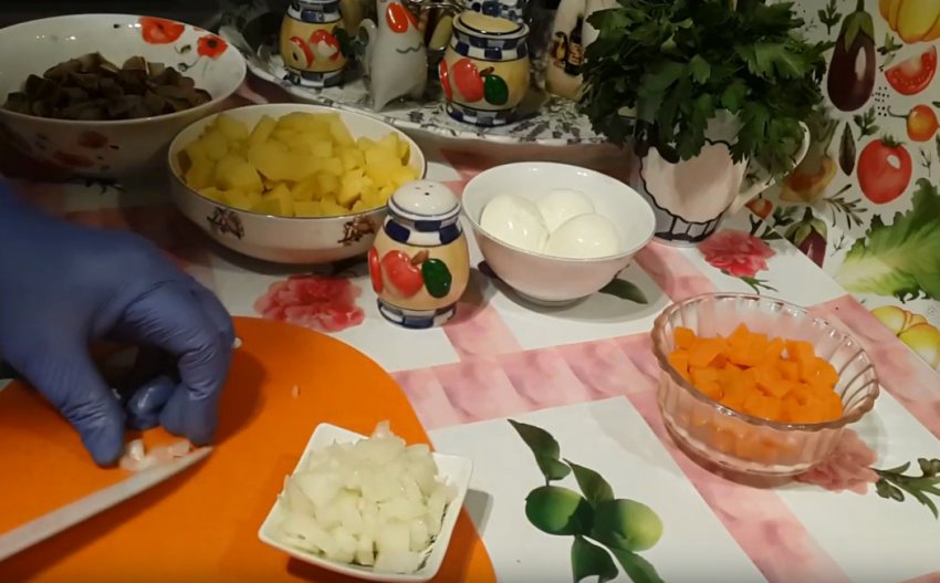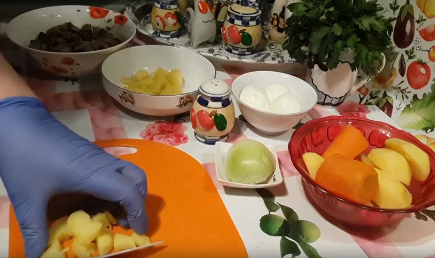 Відваріть картоплю і моркву "в мундирах", остудіть їх, зніміть шкірку, наріжте дрібними кубиками.![]()