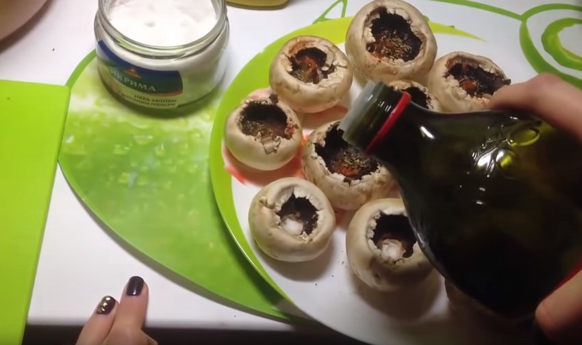 Промийте гриби, видаліть ніжки. Використовуйте капелюшки цілими, налийте в кожен капелюшок трохи оливкової олії.![]()