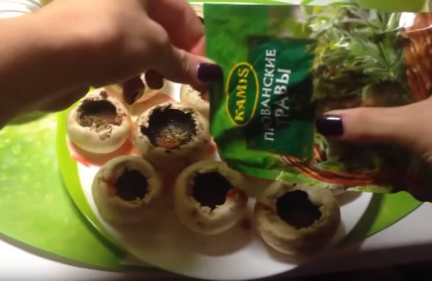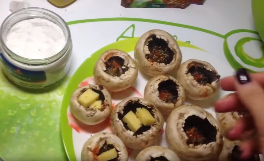 Заздалегідь порізаний кубиками сир помістіть всередину кожного капелюшка гриба.![]()