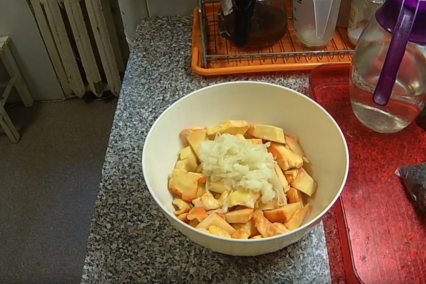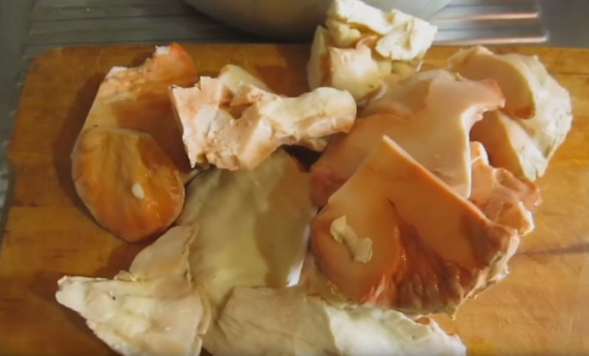Промитий і відварений гриб порізати кубиками.![]()