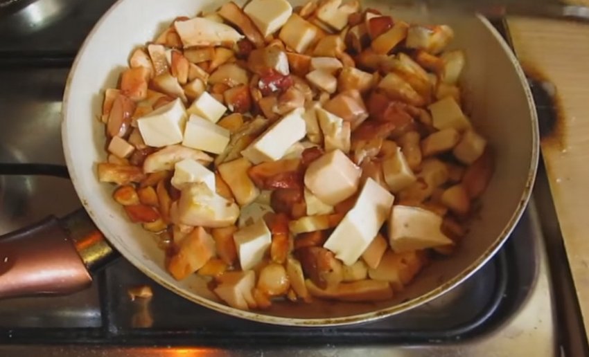 При постійному помішуванні підсмажити трутовик до утворення золотистої скоринки. Ввести плавлений сир.![]()