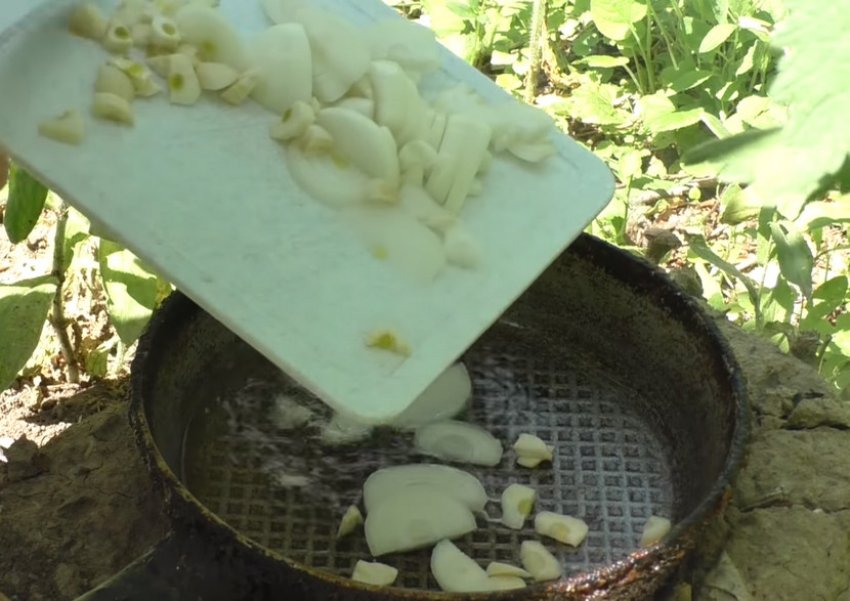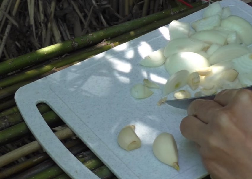 Провести нарізання цибулини півкільцями, часнику - пластинами.![]()