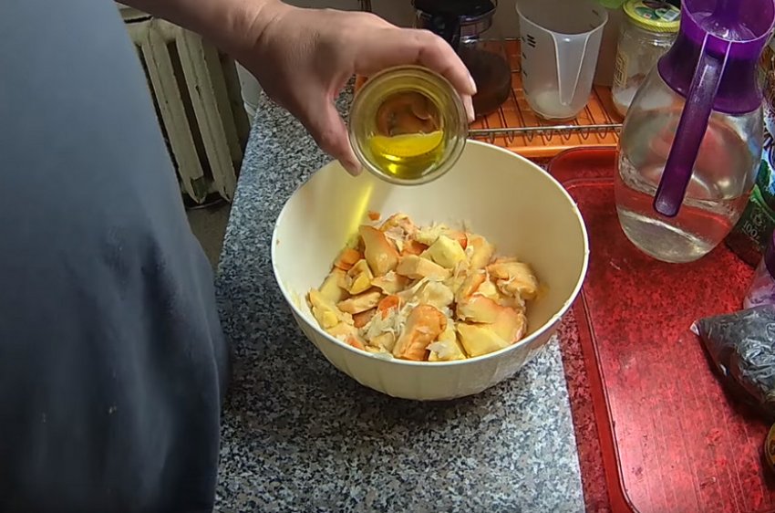 Влити гірчичну олію, соєвий соус. Додати подрібнений часник, спеції, сіль. Маринувати 2 години.![]()