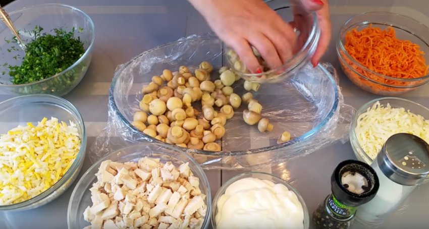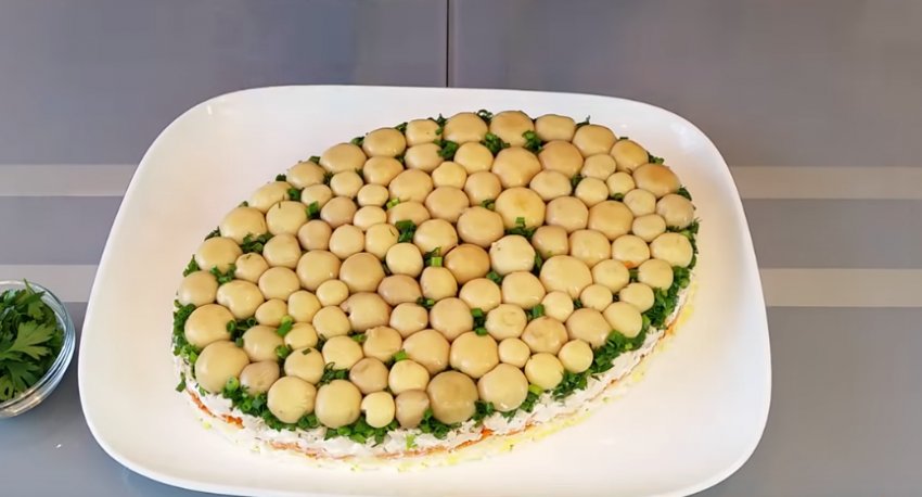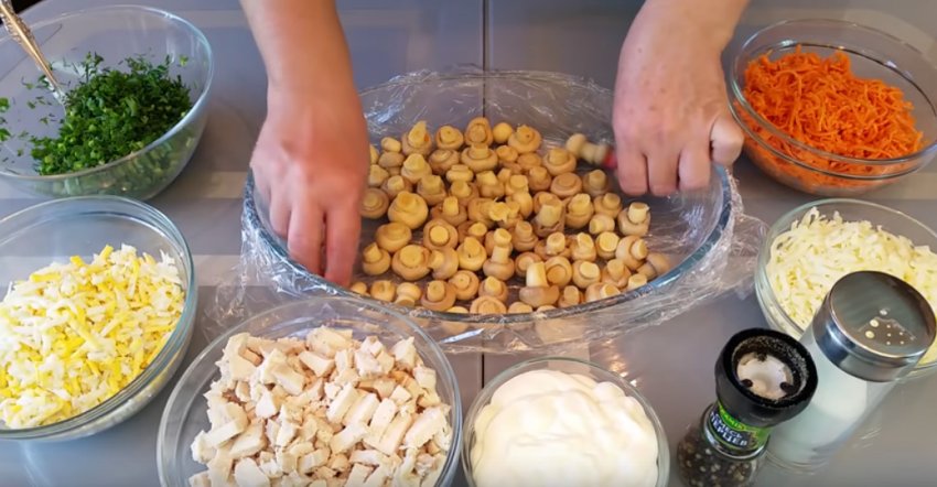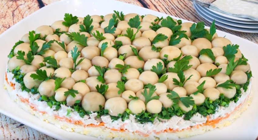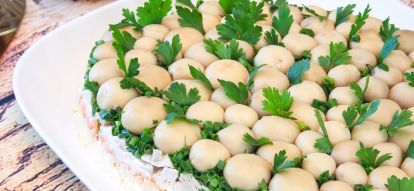 Рецепт салату "Грибна галявина" з печерицямиВидео-рецепт: Рецепт салату "Грибна галявина" з печерицями