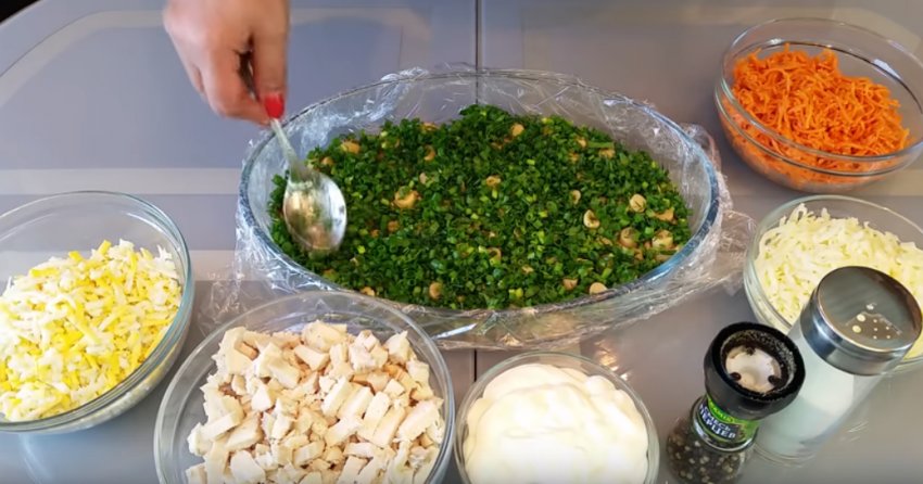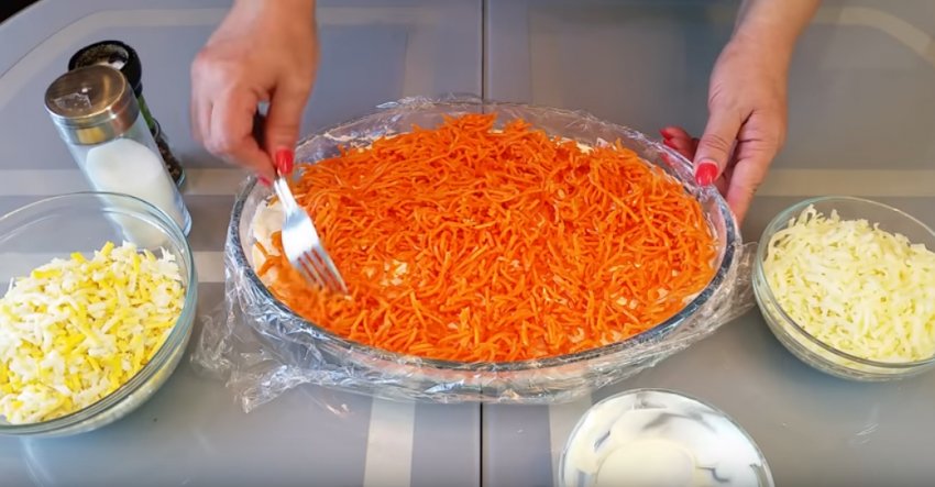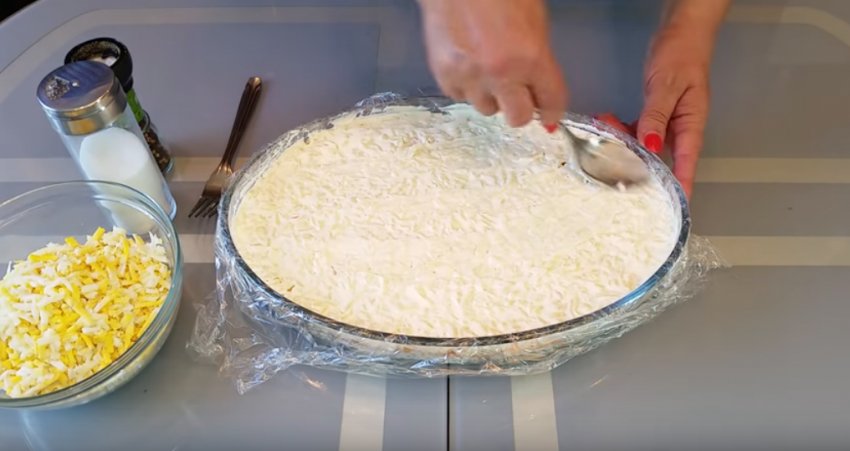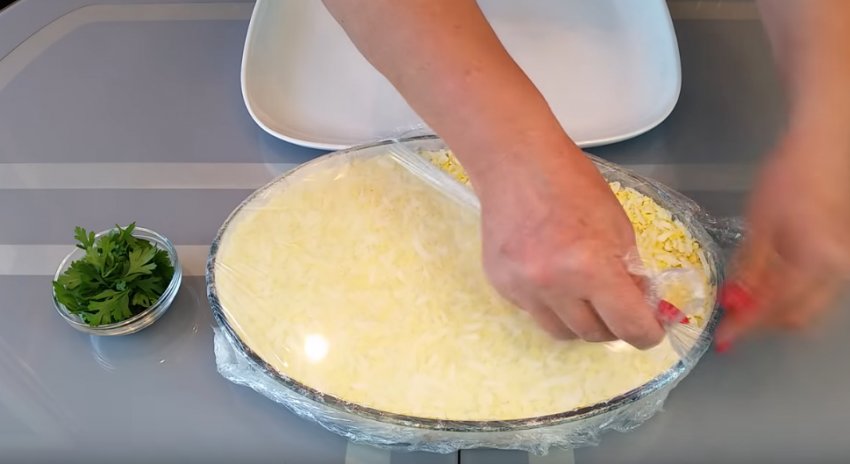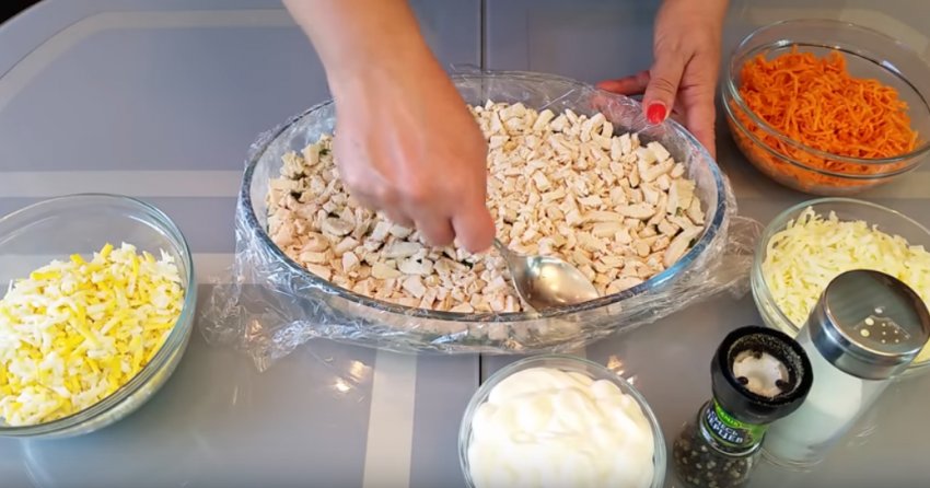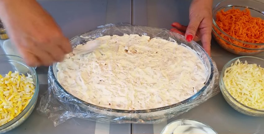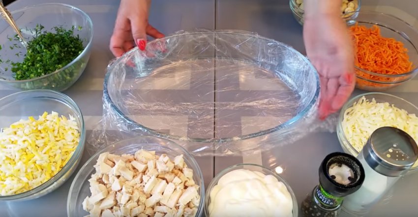 - Для змішування складових потрібно також підготувати харчову плівку, велику овальну або круглу (пластмасову/скляну) форму для викладання шарів і ложку для змащування майонезом/сметаною, а також блюдо, на якому подаватиметься салат.